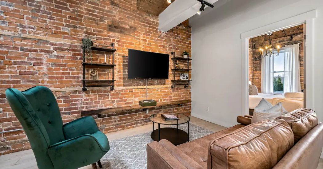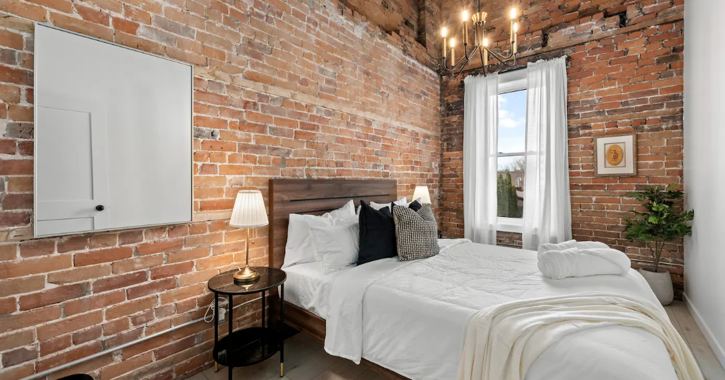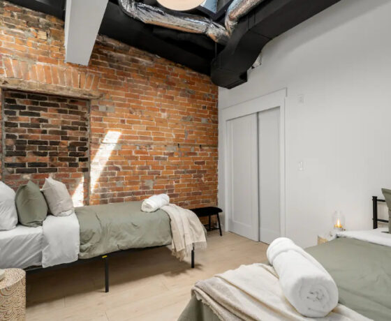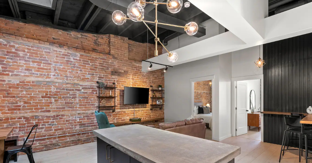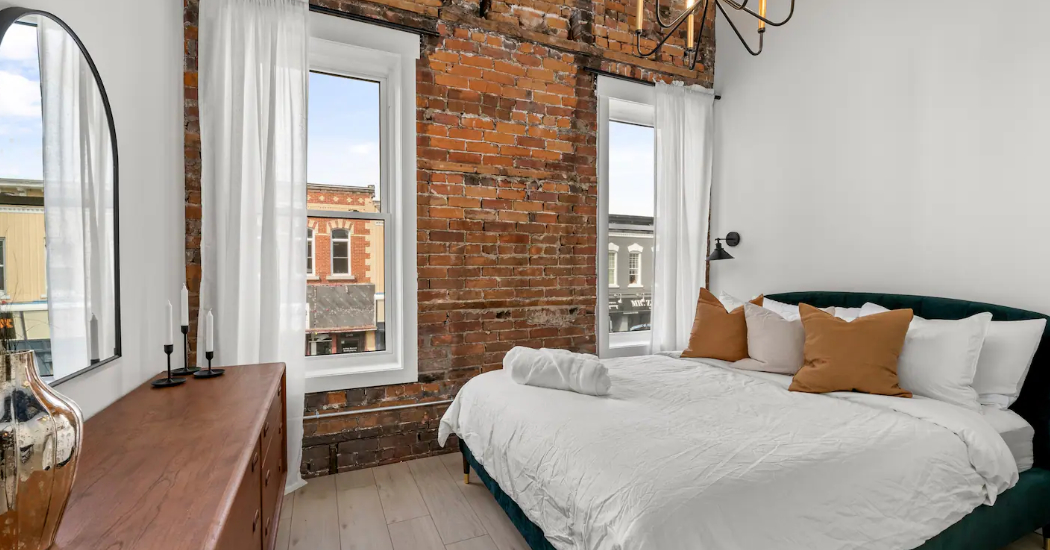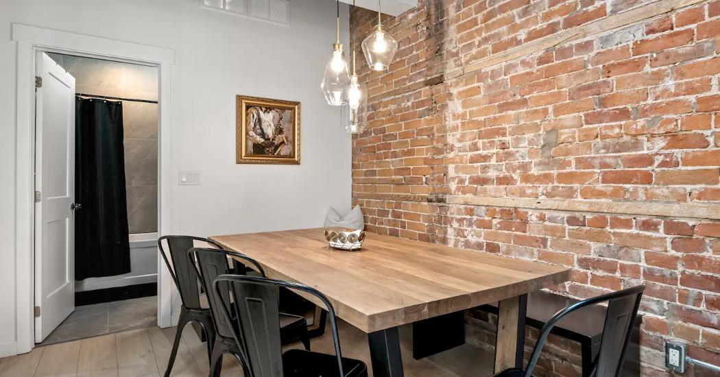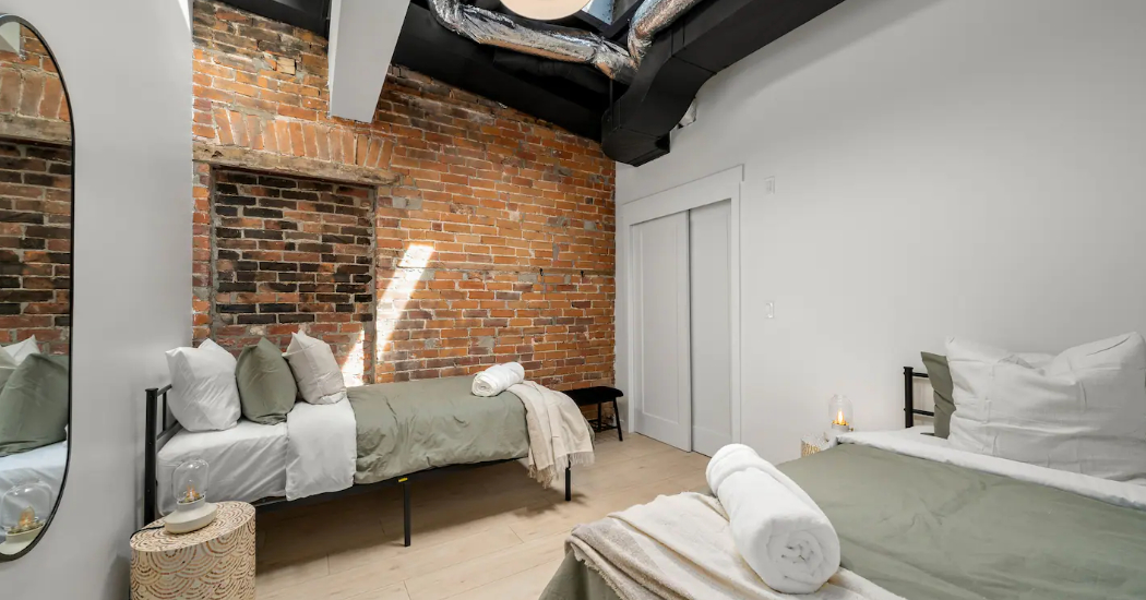 The Goodman features a modern, open concept living and dining area, three bedrooms, and one bathroom with skylights and exposed brick throughout. The two main bedrooms feature Queen-size beds and large windows. The third bedroom features two Twin-size beds, and a skylight. The kitchen is fully equipped with stainless steel appliances, basic cookware, dinnerware, and small appliances including a Keurig for your morning coffee.