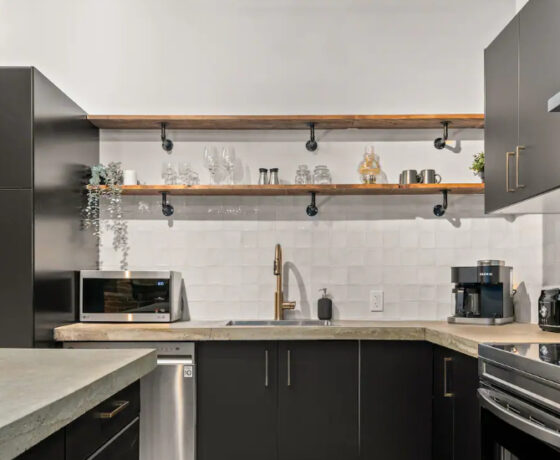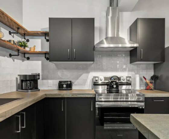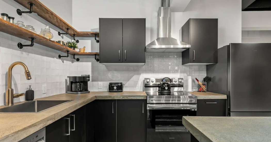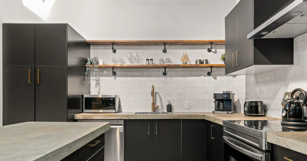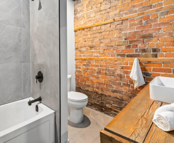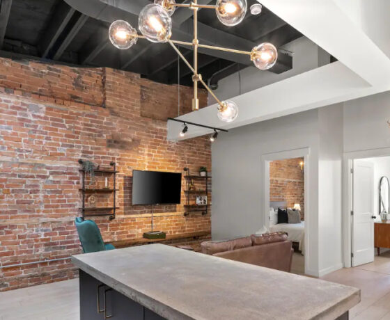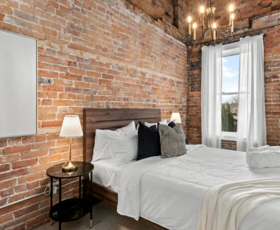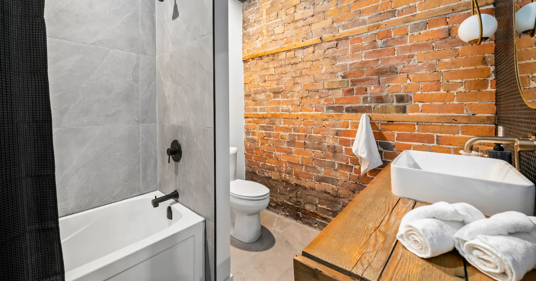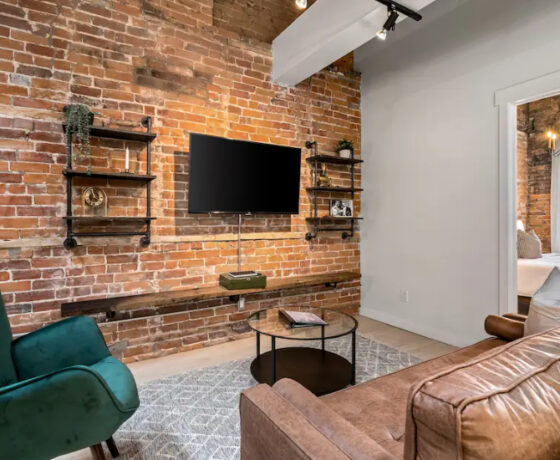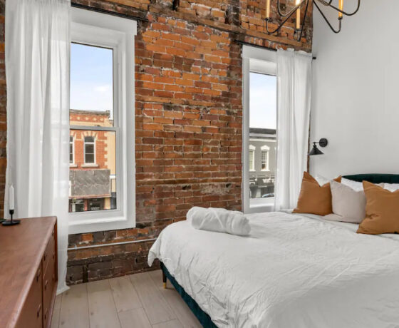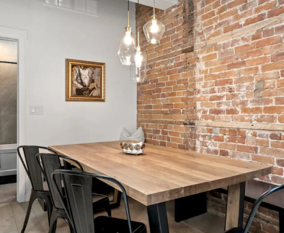 The Goodman features a modern, open concept living and dining area, three bedrooms, and one bathroom with skylights and exposed brick throughout. The two main bedrooms feature Queen-size beds and large windows. The third bedroom features two Twin-size beds, and a skylight. The kitchen is fully equipped with stainless steel appliances, basic cookware, dinnerware, and small appliances including a Keurig for your morning coffee.